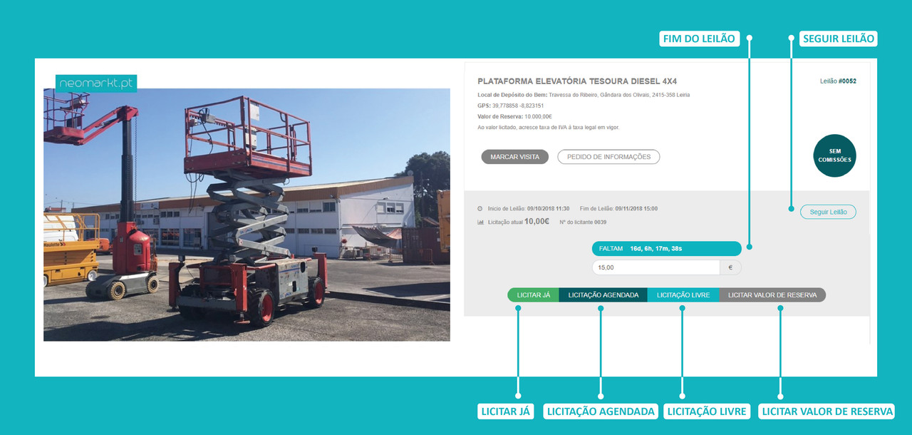 Leilão eletrónico: Recorrendo aos quatros botões disponíveis para o efeito, os licitantes podem contra licitar para a compra de determinado bem até à data final estabelecida para cada leilão. O licitante que tenha a maior licitação para o bem, compra o mesmo, desde que a essa seja superior ao valor de reserva, ou não sendo, que o vendedor aceite vender o bem pelo maior valor licitado.
